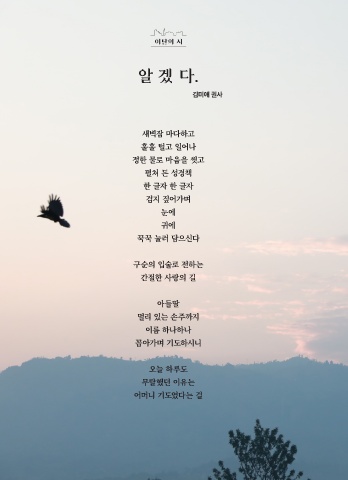 알 겠 다. 알 겠 다. 김미애 권사 새벽잠 마다하고 훌훌 털고 일어나 정한 물로 마음을 씻고 펼쳐 든 성경책 한 글자 한 글자 검지 짚어가며 눈에 귀에 꾹꾹 눌러 담으신다 구순의 입술로 전하는 간절한 사랑의 길 아들딸 멀리 있는 손주까지 이름 하나하나 꼽아가며 기도하시니 오늘 하루도 무탈했던 이유는 어머니 기도였다는 걸 4 CHUNGDONGSEM