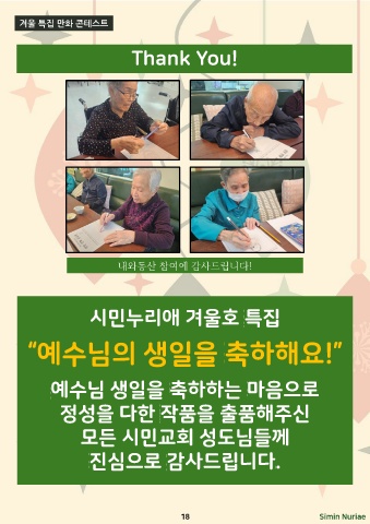 겨울 특집 만화 콘테스트 Thank You! 내와동산 참여에 감사드립니다! 시민누리애겨울호특집 “예수님의생일을축하해요!” 예수님생일을축하하는마음으로 정성을다한작품을출품해주신 모든시민교회성도님들께 . 진심으로감사드립니다 18 Simin Nuriae